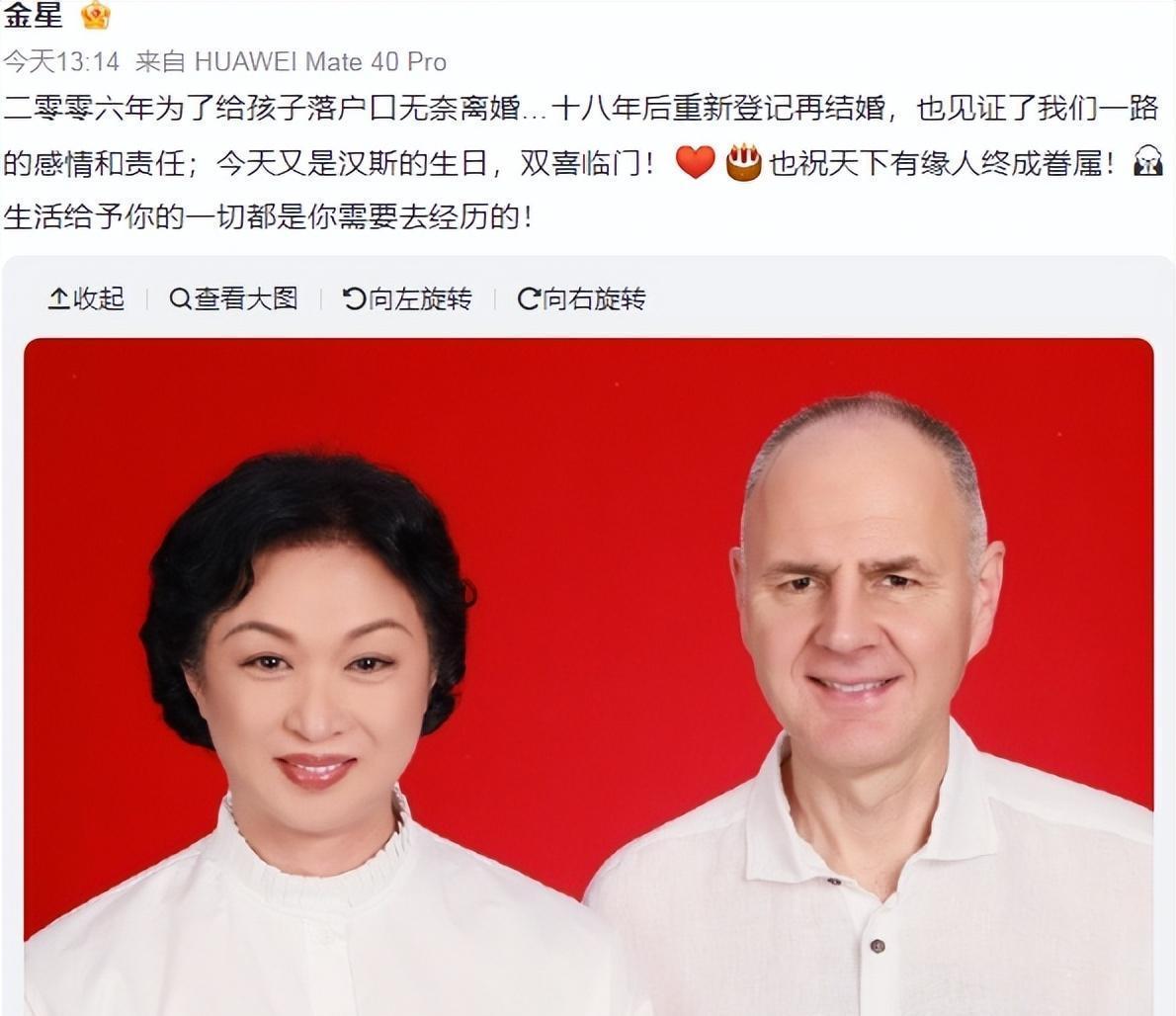 4月11日,金星发文臣宣复婚,称当初是为了给孩子上户口无奈仳离,而如今18年后再次选用登记授室,见证了一齐的情谊和背负。并显现今天是汉斯的诞辰,可谓双喜临门。终末金星亦然道贺宇宙多情东谈主终成婚族。颂赞:糊口给以我方的王人是需要去经验的。